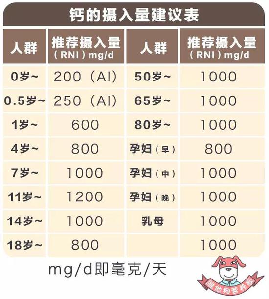下面这张表是我国居民膳食指南推荐每日钙摄入量。